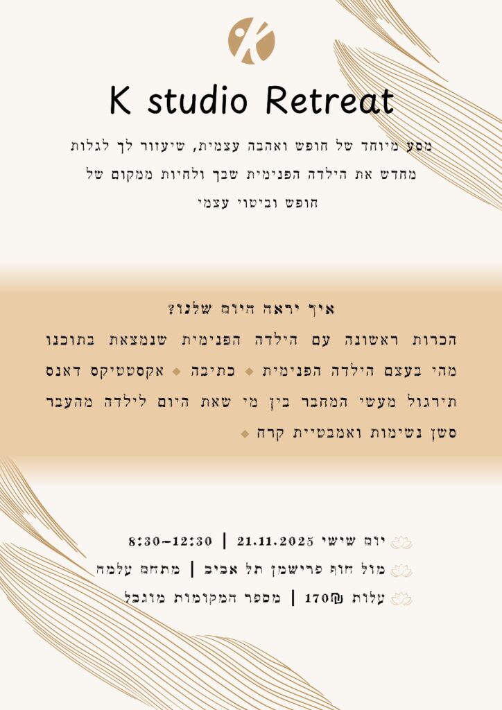 KStudio Retreat תאריך ושעה 21.11.2025, 08:30 מיקום חוף פרישמן- מתחם עלמה תפוסה 7 מתוך 22 סטטוס זמין ₪170 לאדם רכישת כרטיס ביטול הרשמה